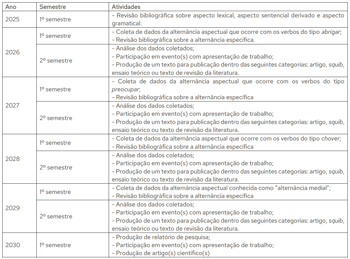 O presente projeto se insere na linha de pesquisa “Teoria, descrição e análise linguística”, mais especificamente na área de estudos da Interface Sintaxe-Semântica Lexical, e se estrutura da seguinte maneira: na seção 2 e em suas subseções, apresentamos nosso objeto de estudo, justificativas, hipóteses, objetivos e metodologia; na seção 3 e em suas subseções, explicamos o referencial teórico que norteará nossa pesquisa; e na seção 4, apresentamos nosso plano de trabalho, planejado para ser desenvolvido durante o período de cinco anos.