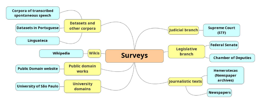 The surveys started by a broad typology (Figure 1), divided in seven types, as detailed below. The seven broad types first defined were categories that allowed us to group all the domains researched up to that point: judicial branch of government; legislative branch of government; datasets and other corpora; public domain works; wikis; university domains; and journalistic texts. As we chose the sources to be surveyed for the broad typology, we gave priority to those with open data and a large volume of files, since the process of requisition of rights of use would only take place in later stages of the project. Therefore, the sources that had copyright-protected data (for instance, the journalistic texts) were not prioritized in the first moment (Crespo et al., 2022).