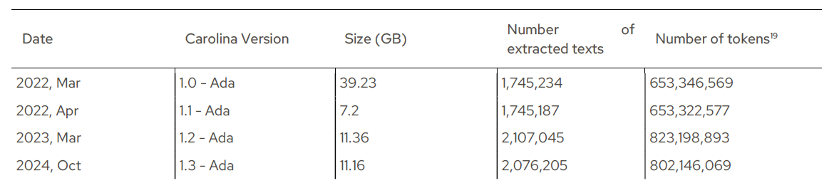 Since 2022, four versions of Carolina Ada have been published, each one with few updates or corrections in relation to the previous version. Table 2 below shows the schedule and size of each version, more information about all of them you can find on the corpus’ webpage (https://sites.usp.br/corpuscarolina).