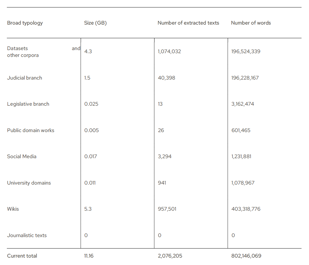 The information presented in Table 3 concerns the XML corpus, which represents the final stage of Carolina 1.3 Ada version, containing texts extracted from open source web domains, balanced data, and their respective metadata encoded. The texts in the XML version have already been preprocessed, filtered, and deduplicated. Besides, it is valuable to mention that some websites or even entire broad types (such as the journalistic texts), which require the explicit authorization of their copyright owners to be made available (and, therefore, are still in the course of requisition of rights of use), are not being accounted for in the numbers.