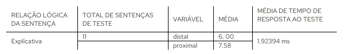 Ao correlacionarmos os dados apresentados na Tabela 1, descobrimos que há indícios nos resultados de que a maioria das escolhas dos leitores dos grupos foi pelo antecedente na posição proximal da anáfora (função sintática de objeto) nas duas sentenças de Teste que trazem a relação lógica Adversativa. Tal indício encontrado dialoga com os achados de Streb et. al (2004), que em um estudo encontraram resultados de que a distância mais curta tem a vantagem de permitir uma compreensão mais rápida se comparada às distâncias maiores, além de demandar menos custo em termos de memória de trabalho.