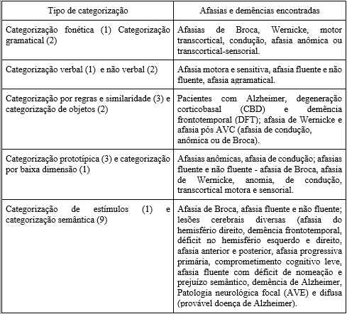 Pode-se concluir que sujeitos diagnosticados com algumas classificações de afasias ou déficit cognitivo possuem os níveis de compreensão e produção linguísticos comprometidos durante a realização de uma tarefa ou teste de categorização. Na revisão realizada, foram encontradas pesquisas sobre 5 tipos principais de afasias e outras gerais e 10 tipos de categorização. Dentre esses números, vale destacar, em nível de déficit cognitivo, os trabalhos sobre a Doença de Alzheimer, Demência Frontotemporal e as afasias fluentes e não fluentes. Já sobre os tipos de categorização, foram encontrados em nível linguístico, tais como: verbal e não verbal, fonética, gramatical, e em nível linguístico cognitivo destacam a categorização semântica, de estímulos, baixa dimensão e prototípica. A hipótese que predizemos é corroborada a partir da discussão das principais informações extraídas pela revisão dos artigos, as quais revelam um desempenho pior ou igual de um sujeito com afasia comparado a um sujeito típico. Por fim, vale ressaltar as relações entre o processo da categorização linguístico-cognitiva e as afasias e demências que são exemplificadas pelos estudos tratando, especialmente, a categorização prototípica e semântica em indivíduos com DA, AVC ou demência frontotemporal. Ademais, esses quadros clínicos apresentam como principais características comprometimento na memória e conhecimentos semânticos, e, consequentemente, em atividades de ordem linguística que requerem uso desses conhecimentos.