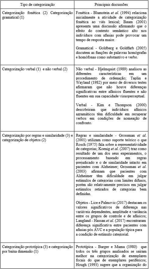 Após a seleção, leitura e fichamento dos artigos foram encontrados estudos envolvendo os seguintes tipos de categorização: prototípica, semântica, fonética, por regras e similaridade, por baixa dimensão, de objetos, estímulos (domínio perceptivo e semântico), de verbos, não verbal, gramatical e os seguintes tipos de afasias: Broca, Wernicke, Alzheimer, Demência frontotemporal, Acidente Vascular Cerebral (AVC) outras afasias (condução, motora e sensitiva, anômica, fluentes e não fluentes posteriores e anteriores, progressiva primária). A discussão dos artigos foi feita a partir do tipo de categorização, em paralelo com os tipos de afasias, demências ou déficit cognitivo e suas principais discussões que estão presentes nos quadros abaixo.