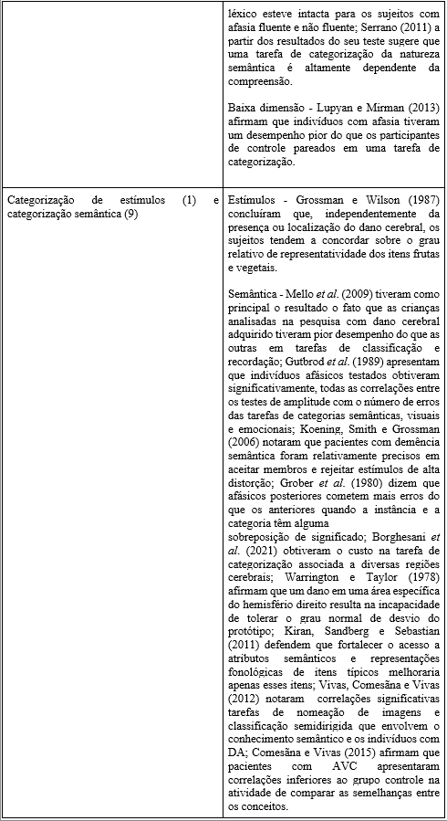 Os quadros 1 e 2 foram elaborados a fim de elucidar melhor sobre o objeto de estudo deste trabalho de forma que seja possível compreender, em primeiro plano, quais são os principais tipos de categorização linguística cognitiva trabalhados até o momento, bem como essa sendo analisada e discutida em pessoas com algum déficit cognitivo. A vasta variedade de trabalhos encontrados, além de moldar um acervo interessante sobre o tema, traz discussões pertinentes sobre o fenômeno estudado e como ele pode ser tratado em quadros clínicos diferentes. Isso se dá, principalmente, pelas informações iniciais que se sabe sobre a afasia ou demência, como também seus tipos específicos. Algumas hipóteses dos trabalhos analisados tiveram como predição a de que pessoas com algum comprometimento cognitivo apresentariam custos maiores durante a realização da atividade neurocognitiva (categorização), uma vez que, é parte da semiologia de algumas afasias e demências um comprometimento em atividades de ordem linguística. Entretanto, alguns trabalhos obtiveram como resultados, diferenças significativas entre dois grupos diferentes de afásicos, como por exemplo, os fluentes e não fluentes; como também, foram encontrados um “equilíbrio” nos resultados. Isto é, alguns trabalhos evidenciaram pontos positivos e negativos sobre o grupo clínico investigado, levando em consideração os impactos desses pontos na análise da categorização.