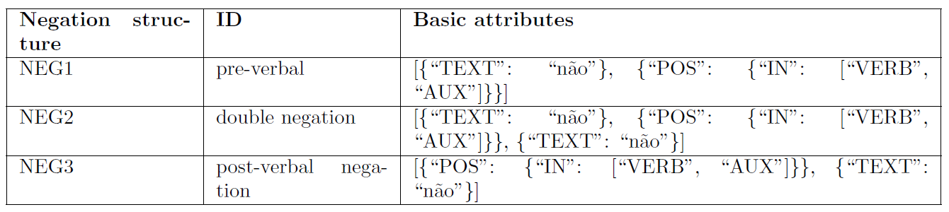 spaCy (Honnibal et al., 2020) is an open-source library for advanced natural language processing in Python. Its features and functionalities are related to linguistics, such as tokenization and data labeling, and also to machine learning (ML), such as model training. In addition to the variety of resources applied to NLP, spaCy also stands out for its pre-trained models for different languages, with 80 pipelines trained for 24 languages. For Brazilian Portuguese (BP), this library has 3 pre-trained models, differing in their size, training datasets, and functionalities. In this work, we use pt_core_news_lg, a pipeline recommended for tasks in which greater accuracy is required[1]. For negativas, three spaCy functionalities are central to its development and operation: tokenization, POS-tagging, and Rule-based Matching.