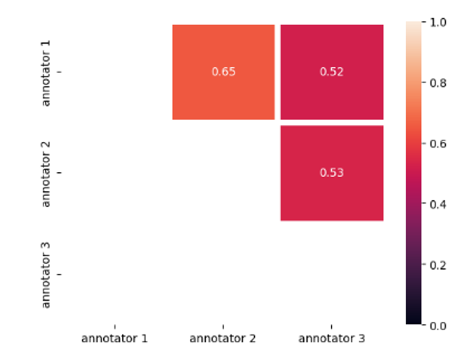 The data annotation obtained 0.57 of agreement (Fleiss’ Kappa), which is considered a moderate value. Cohen’s Kappa was calculated for each pair of annotators and generated values between 0.52 and 0.65 (Figure 1). Human annotations resulted in 1893 (90.8%) occurrences of the pre-verbal structure, 92 (4.4%) occurrences of the post-verbal structure, and 100 (4.8%) of double negation.