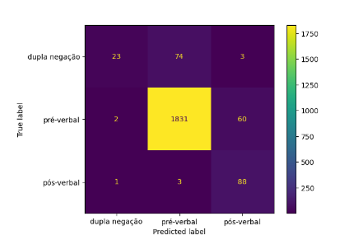 negativas has proved to be efficient in finding and classifying negative structures with não, but it does have its limitations. Such as the occurrence of double negation, which in some cases is not recognized as an individual syntactic structure, returning an occurrence that is simultaneously classified as NEG1, NEG2, and NEG3, and also the treatment of intervening material present in the data, which ends up making it difficult to model the search patterns. Another notable limitation relates to the data imbalance, with NEG1 structures being significantly more frequent than other categories, which adversely affects precision when calculating classification metrics.