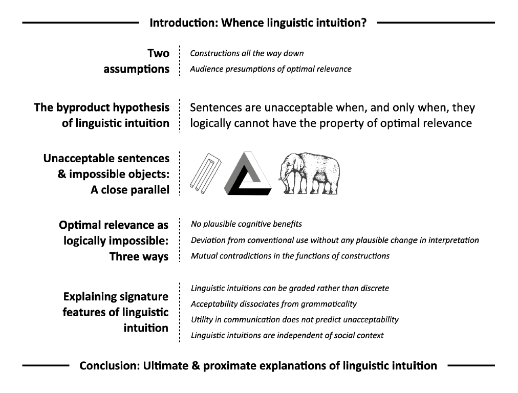 In §3 I motivate and clarify the hypothesis further, by highlighting a close parallel between linguistic intuitions and the psychological sense of oddness that accompanies so-called ‘impossible objects’: visual illusions in which stimuli appear as objects but which are logically impossible to interpret in any way consistent with the unconscious presumptions that govern the interpretation of all stimuli perceived as objects. This parallel helps to make clear how linguistic intuitions are, at bottom, not properly about grammaticalness at all: they are rather about communicativeness (more technically, ‘ostensiveness’). In §4 I describe how the byproduct hypothesis predicts linguistic intuitions. Specifically, I derive three general ways in which sentences logically cannot have the property of optimal relevance, and I describe how each triggers intuitions of unacceptability. In §5 I show how the byproduct hypothesis explains four otherwise surprising features of linguistic intuition. I conclude by placing the byproduct hypothesis in a broader cognitive and evolutionary context, as part of the deeply social nature of human minds.