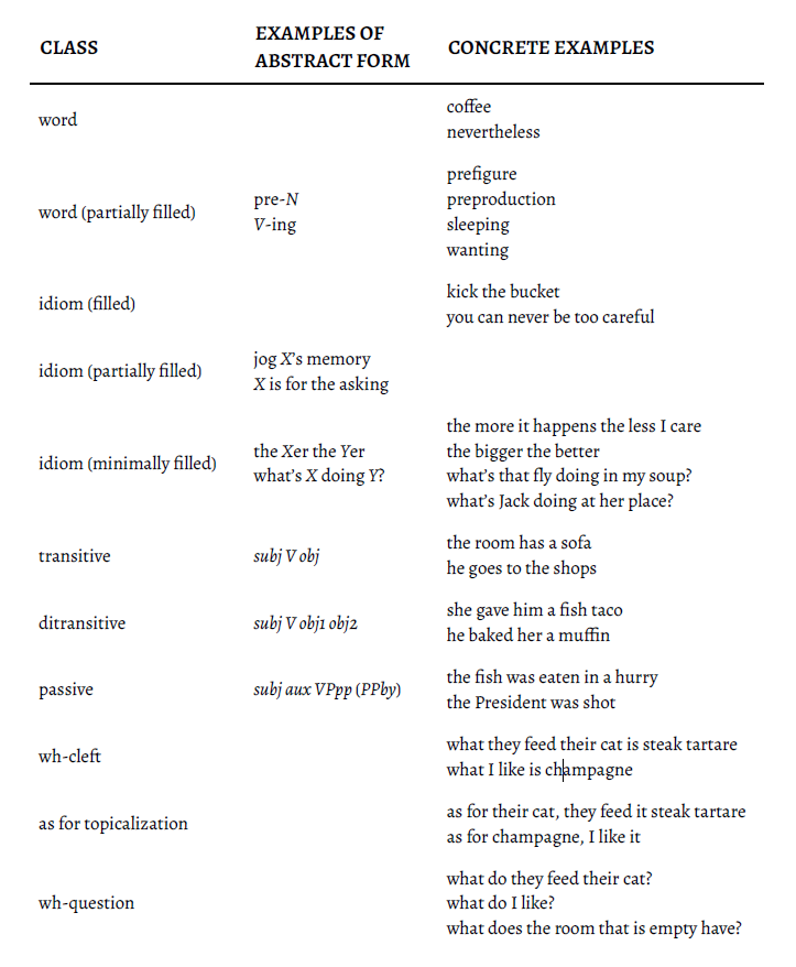 Figure 2. Table 1. Examples of constructions, at varying levels of complexity & abstraction. Adapted from (Goldberg, 2013a). Sentences are assemblies of constructions. For example, the sentence The boy bakes his sister a cake assembles together: ditransitive construction; V-s; two objects; and the lexical constructions The, boy, bake, his, sister, a and cake.