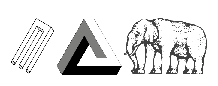 Figure 3. Figure 2. Impossible trident; Penrose triangle; Shepard elephant (all three images are in the public domain). In each image, individual parts are straightforwardly interpretable on their own, but they clash with other parts. This in turn makes it logically impossible to interpret the stimulus in any way consistent with the presumption of physical cohesiveness that governs the interpretation of all stimuli perceived as objects.