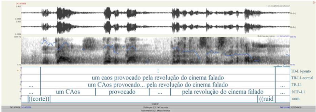 ○ 2 camadas (TB-, NTB-) nas quais a fala de cada locutor (-L1, -L2) e documentador (-DOC1, -DOC2) é segmentada em unidades prosódicas e transcrita de acordo com as normas do Projeto NURC.